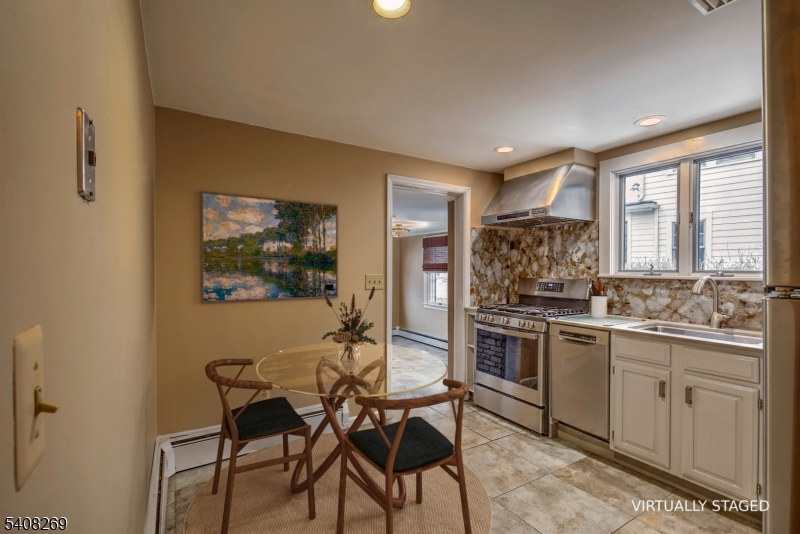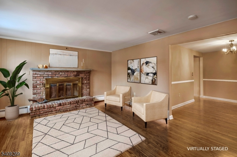 Charming colonial ranch with rooms filled with natural light. Living room with brick fireplace, Dining Room with chandelier, hardwood floors, Hunter-Douglas shades in living room, dining room and bedrooms, ceiling fans in three bedrooms. Tile floor in updated bathroom, kitchen remodeled 2023, new gas stove, refrigerator and dishwasher 2023, tile floor breakfast room 2023,, attic storage, Storage shed with electricity, patio, yard fenced with wood fence/ stone walls, established perennials in front and on side of house ( azaleas, hydrangeas, quince, peonies, rose of Sharon, forsythia and tulips),central air conditioning. Convenient to town, train, schools, shopping, Routes 78 and 287.Fireplace and chimney as is. No known issues.